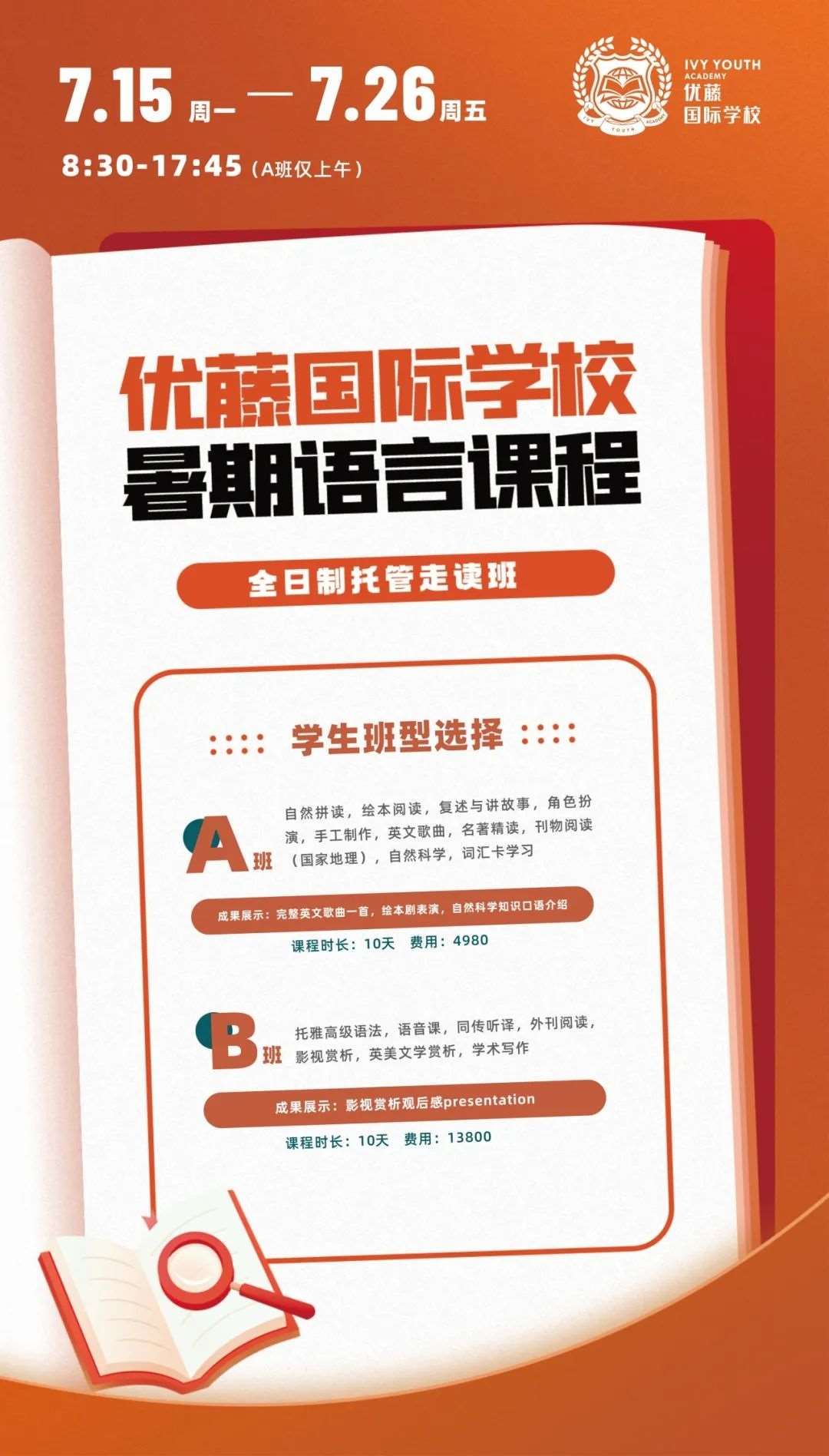 A班:自然拼读,绘本阅读,复述与讲故事,角色扮演,手工制作,英文歌曲,名著精读,刊物阅读(国家地理),自然科学,词汇卡学习