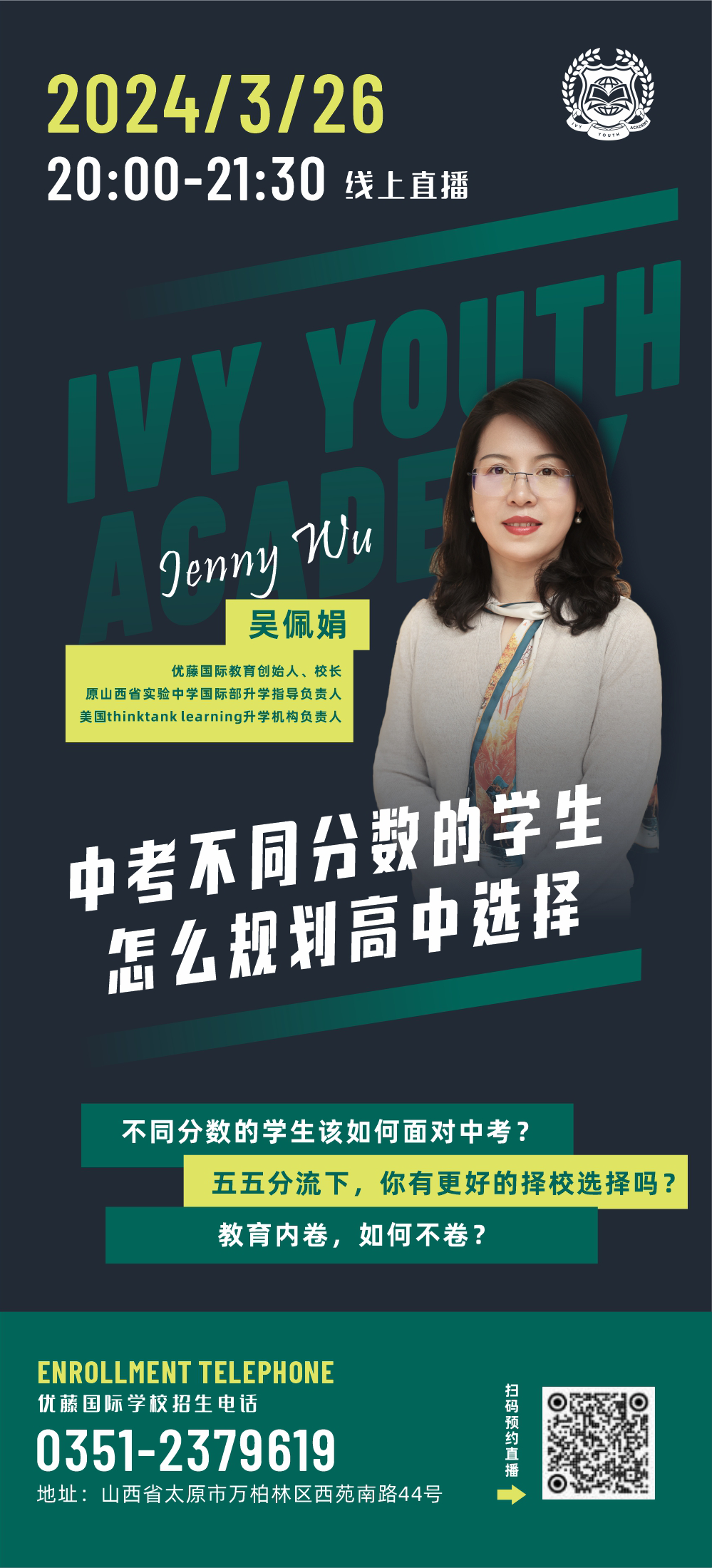 为此,优藤国际教育校长吴佩娟女士,将针对以上问题开展线上讲座,为不同分数段的中考学子,提供个性化的高中择校选择。