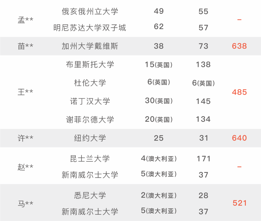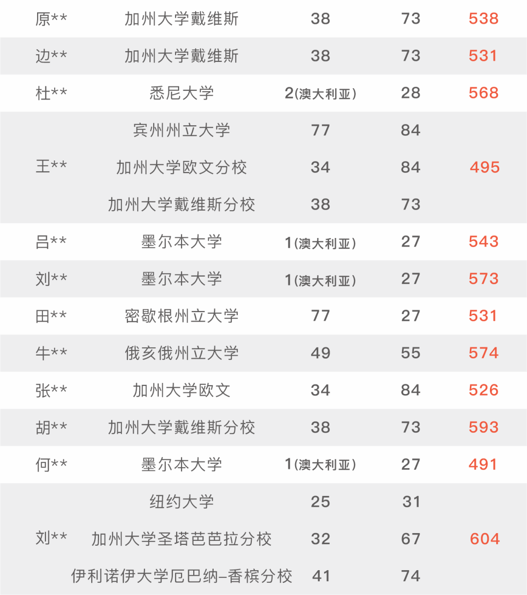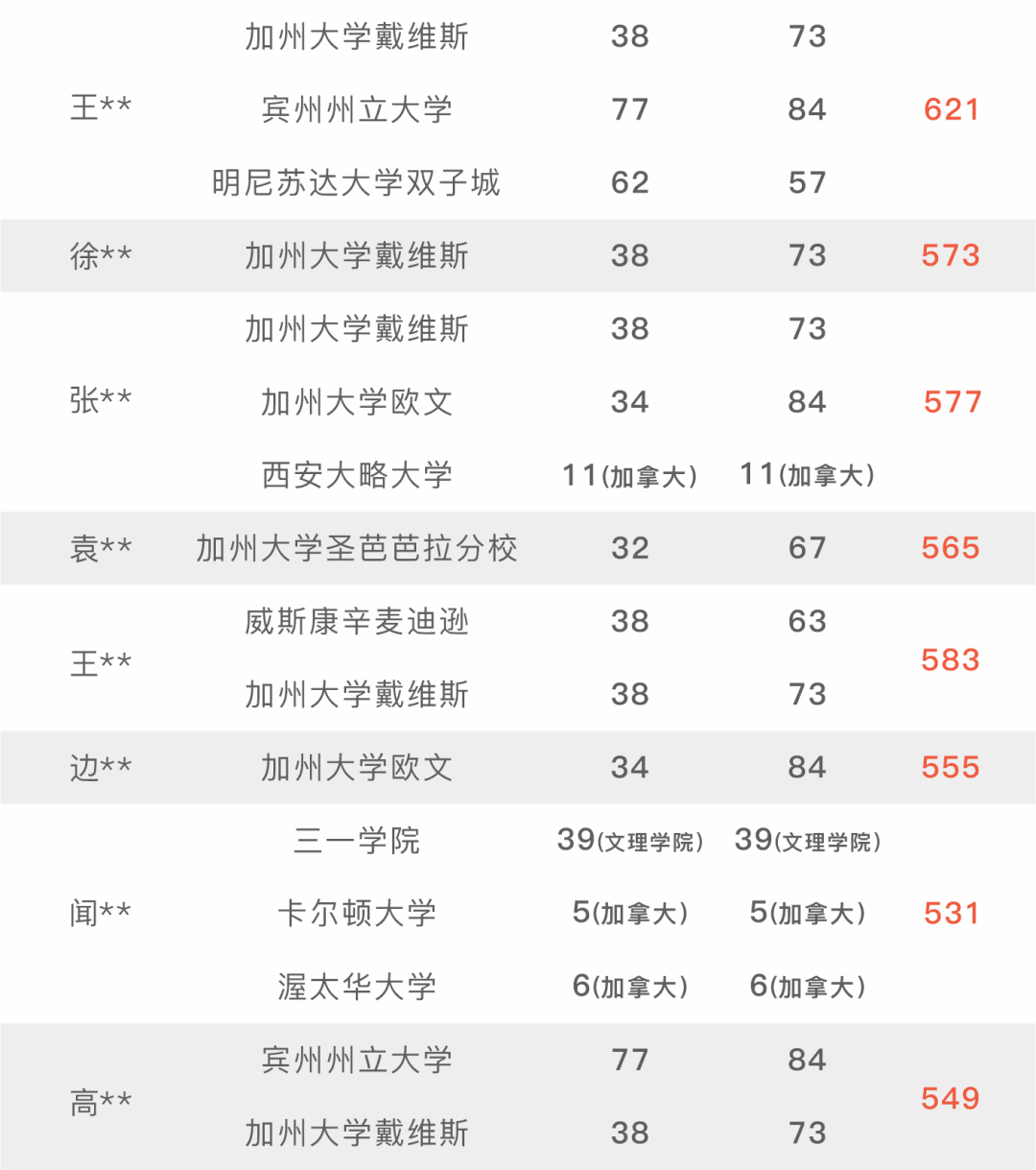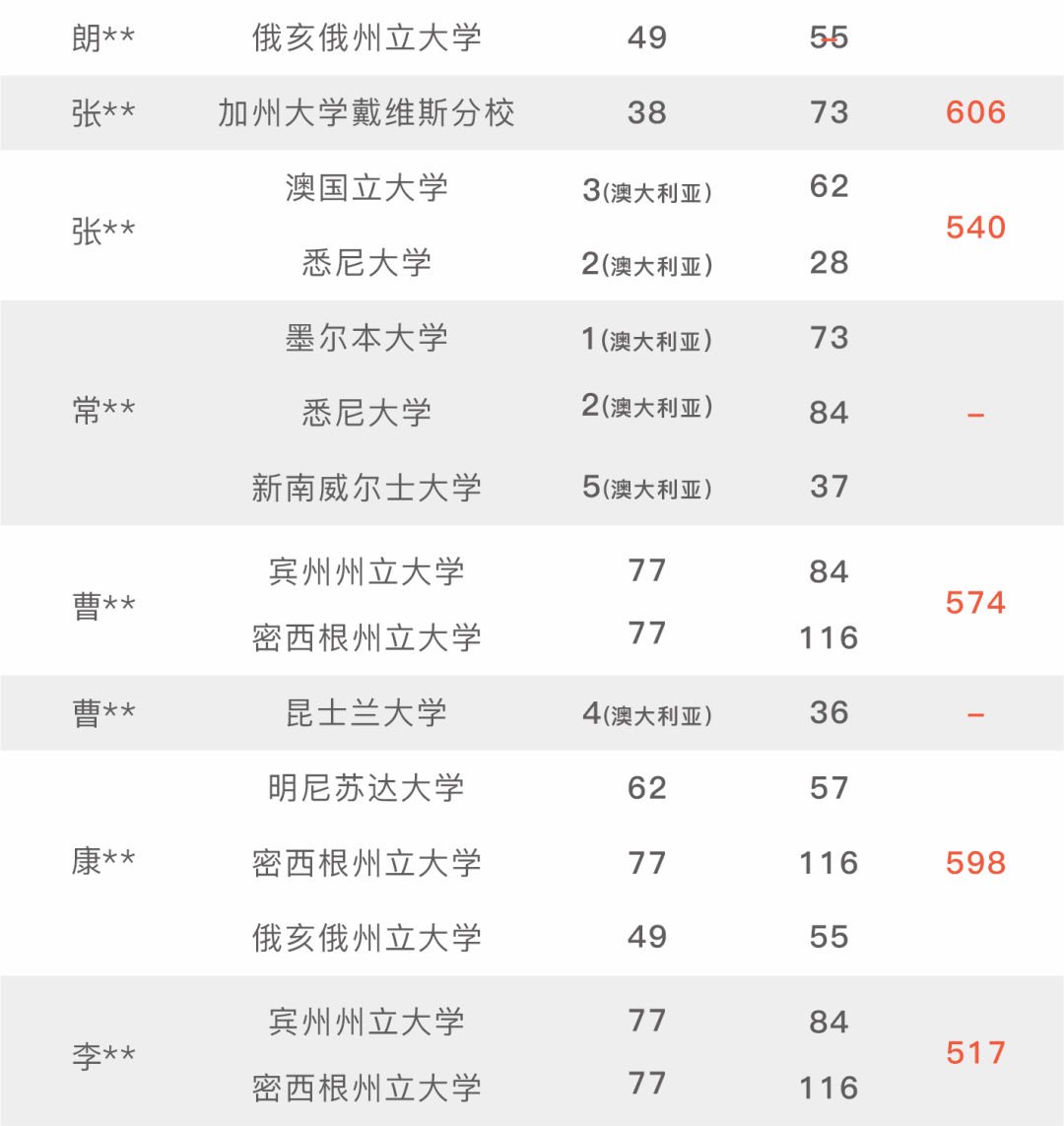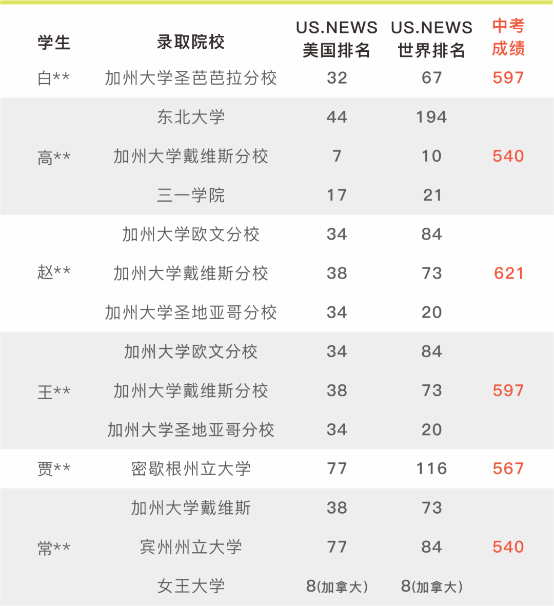 经过时间的沉淀,几年来,吴佩娟带领团队为山西省内学生的大学申请结果已经比肩一线城市。其中,申请美国的学生,67%被美国排名的大学录取;77%被美国排名的大学录取;100%被美国排名的大学录取。申请澳大利亚的学生,100%被澳大利亚排名的大学录取。申请加拿大的学生,100%被加拿大排名的大学录取。申请英国的学生,100%被英国排名的大学录取。