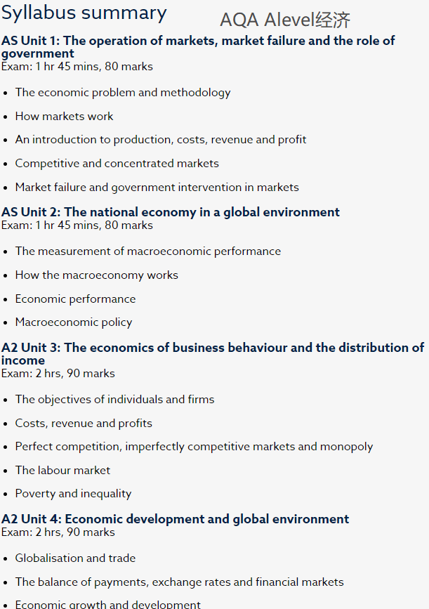 牛津AQA考试局AS/A2阶段分四大经济主题进行考察,一个主题一份paper,每份paper中包括选择题和问答题/essay。