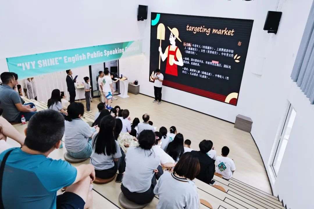 英文演讲环节,同学们用英语梳理模型逻辑,老师们全程陪伴,从英语的规范表达到思维训练,逐字打磨。家长们也受邀而来,大家用流利英语阐述“超级农场”的未来图景——从智慧能源系统的碳减排测算,到生态教育的社会价值量化,再到农业科技孵化器的产业带动模型,同学们展现出自己的学习能力和教育素养。
