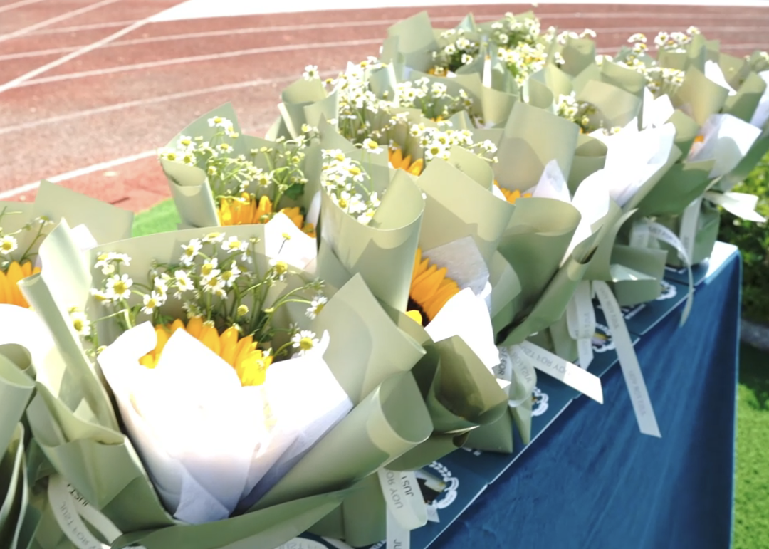 向日葵花束和寄语卡早已摆放整齐,明亮的黄色如阳光般温暖。一张寄语卡上写着:“愿你在优藤向阳而生,逐梦全球,收获成长与友谊。”这份学长与新生间的情谊,让优藤的校园更添温馨,也让同学们感受到,在优藤追逐世界梦想的路上,从不孤单。