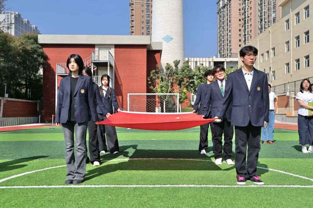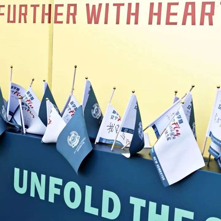 旗帜在微风中飘扬,每一字都承载着师生对新学期的憧憬与对世界的向往,像郑重的承诺,宣告优藤人将以行动“展开新学期,解锁全世界”。