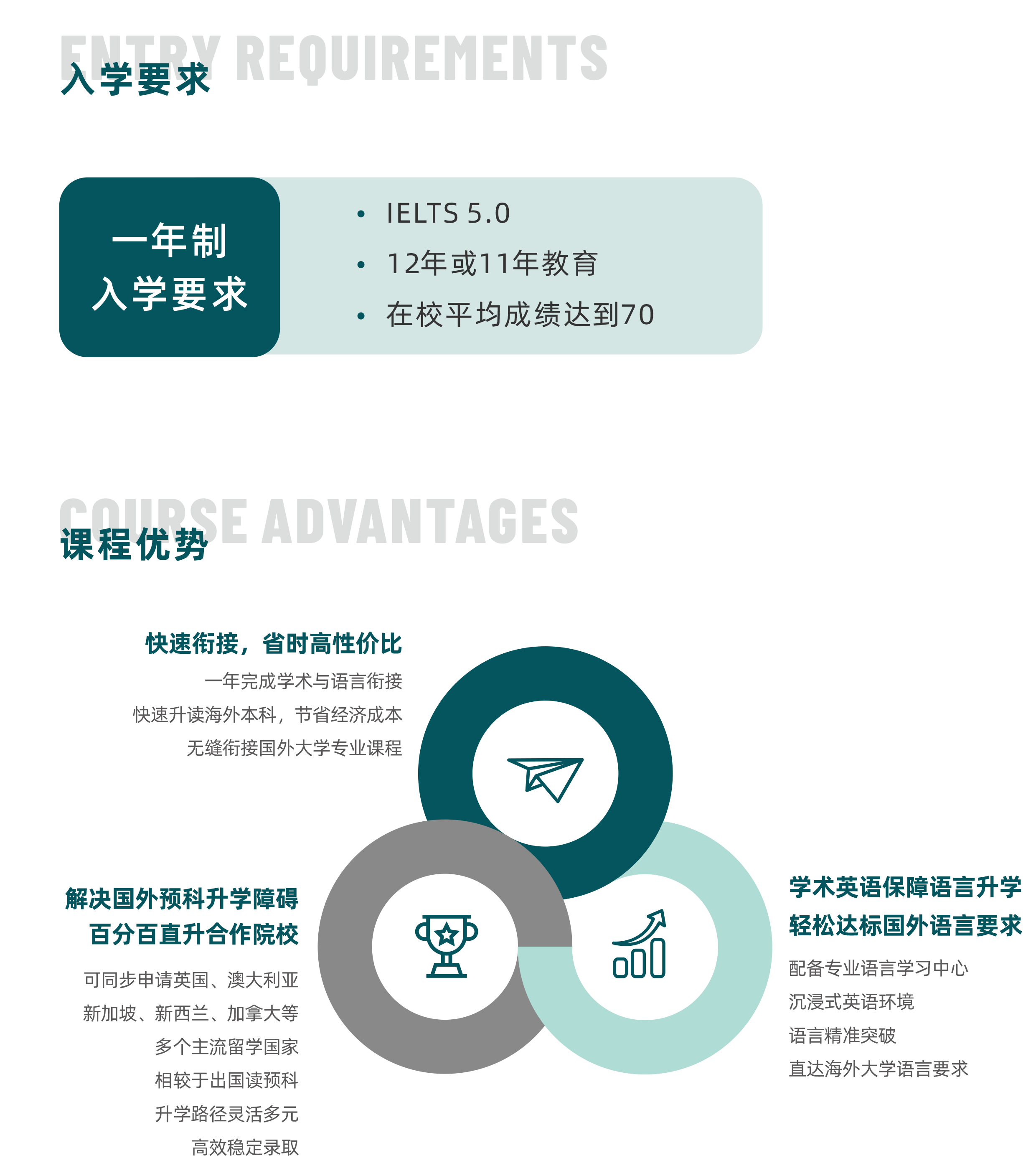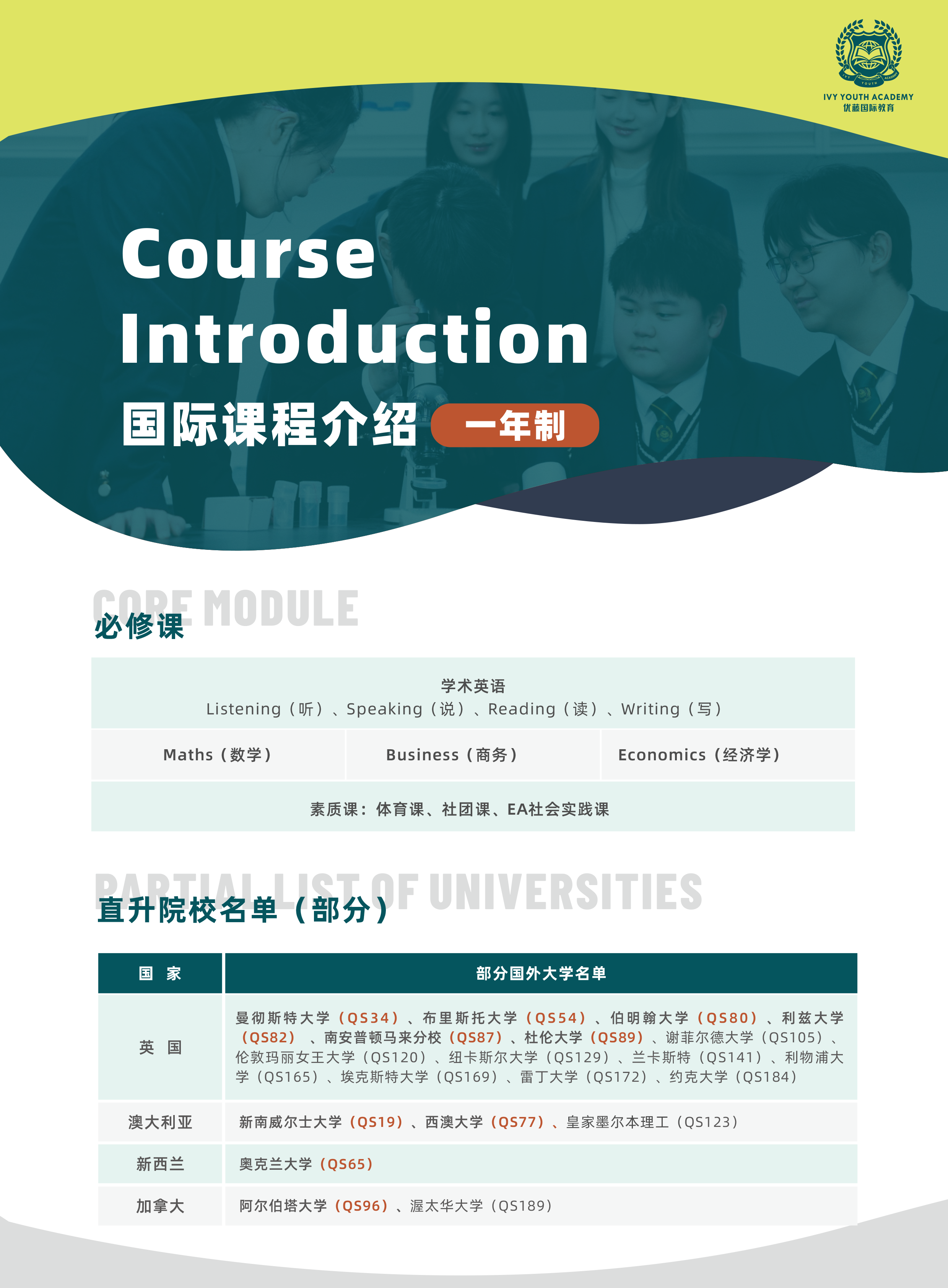一年完成学术与语言衔接 快速升读海外本科,节省经济成本 无缝衔接国外大学专业课程